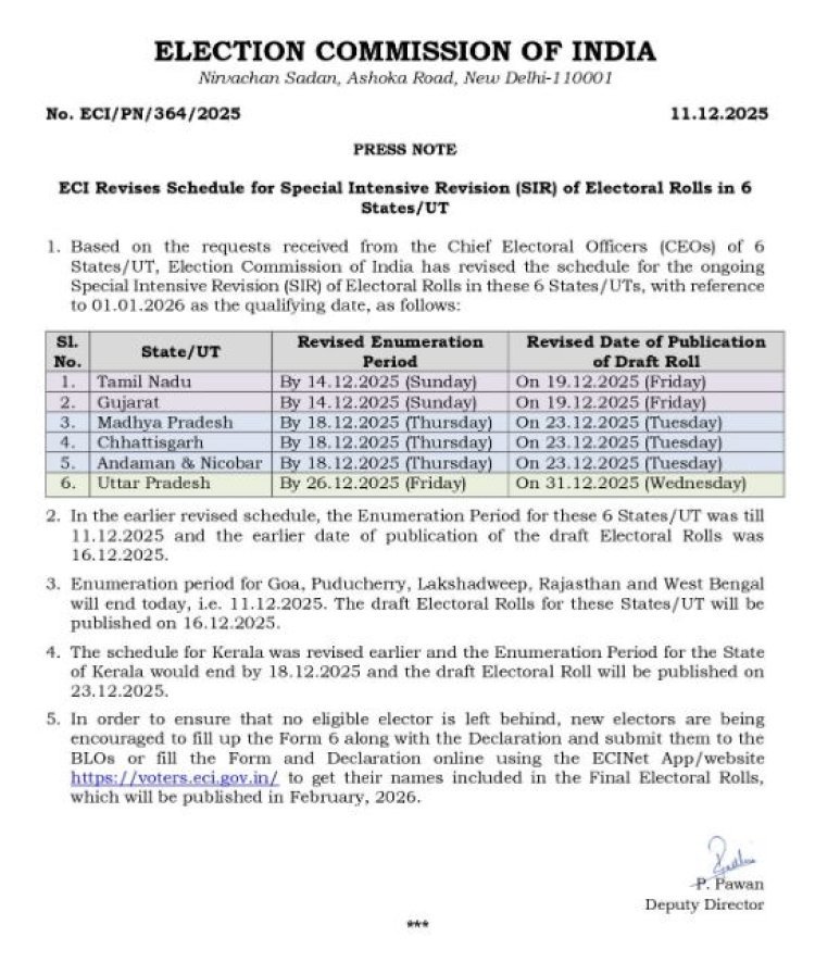 ચૂંટણીપંચે SIRની કામગીરી માટેની અંતીમ તારીખ 6 રાજ્યોમાં લંબાવી છે. ગુજરાત, મધ્યપ્રદેશ, છત્તીસગઢ, તમિલનાડુ અને આંદામાન નિકોબારમાં એક અઠવાડિયા માટે જયારે ઉત્તરપ્રદેશમાં છેલ્લી તારીખ 31 ડિસેમ્બર જાહેર કરવામાં આવી છે અને તે મુજબનું નવું શેડ્યુલ જાહેર કર્યું હતું.